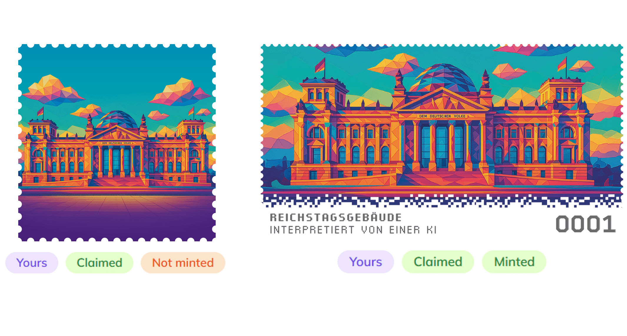 Three exclusive collector albums featuring the 6th NFT "Reichstaggebäude" will be raffled among participants. These limited-edition albums are the perfect addition to any serious crypto stamp collection.